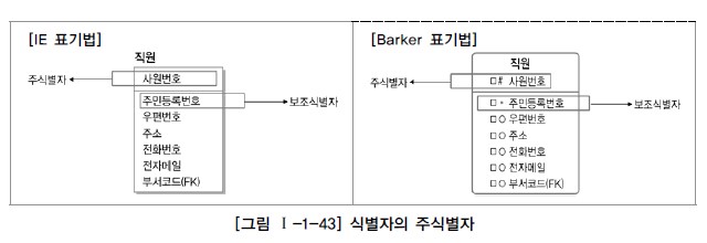 - 직원이라는 엔터티중에서 사원번호와 주민등록번호 모두 유니크한 속성이지만, 사원번호가 직원을 관리할 때 더 흔히사용되고 유리하기 때문에 사원번호를 주식별자로 지정하고, 주민등록 번호를 보조 식별자로 지정함
