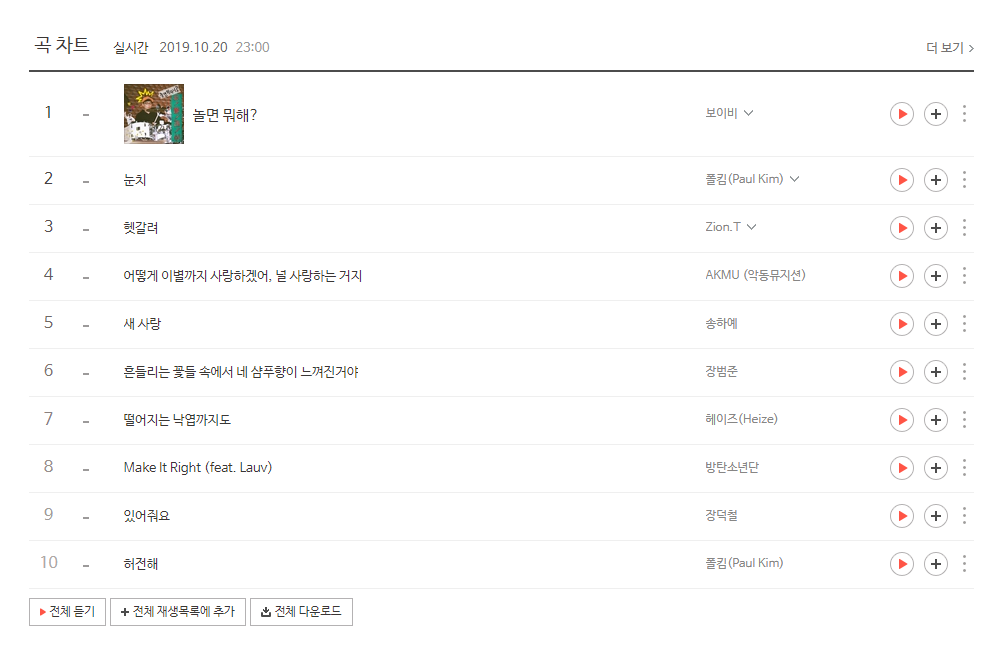 차트를 보면 유플래시가 점령한 것을 볼 수 있다. 다만 벅스에서도 좀 아쉬운 것이, 대형 프로젝트이고 수많은 가수, 뮤지션들이 참여 했는데 가수가 한명만 보인다. 보이비를 디스하는 것은 아니지만 놀면 뭐해?의 곡에서 전혀 존재감이 없었는데 마치 보이비 솔로곡처럼 나오는 것은 벅스에서 하루빨리 수정할 필요성이 있다.