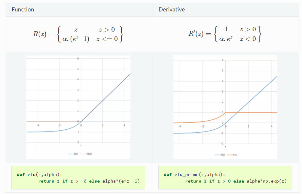 ReLU은 값이 0이하일 땐 모두 0으로 변경을 하기 때문에 Dying ReLU(뉴런이 0을 출력하여 더이상 학습이 안되는 문제)와 같은 문제가 발생할 수 있다. 이를 막고자 나온 개념 중 하나가 ELU function이다.