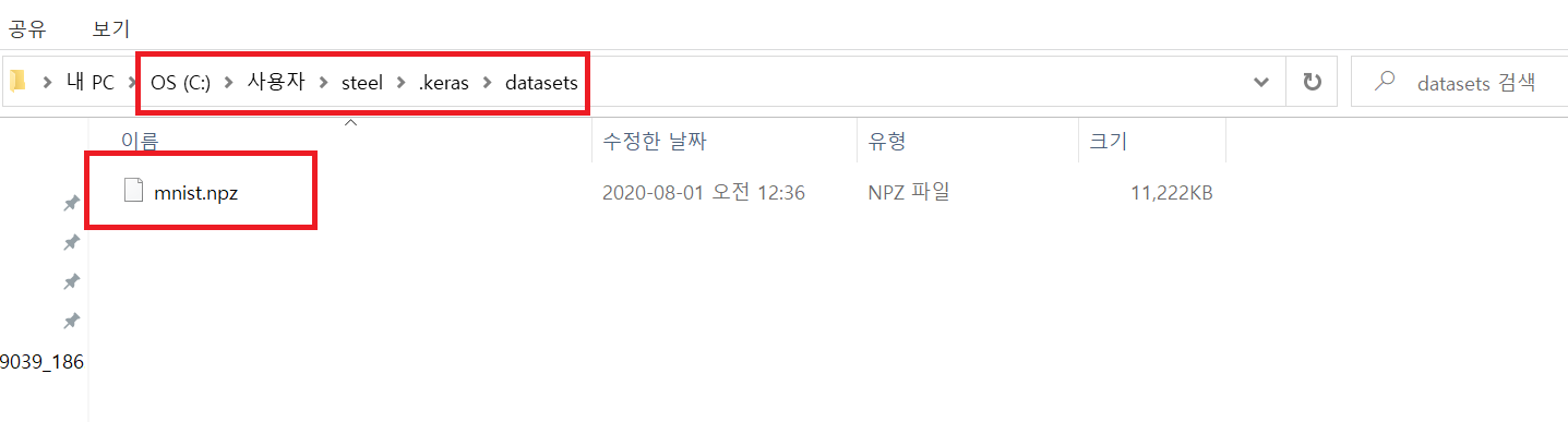 mnist가 없다면 위와 같이 mnist.npz를 다운로드한 후 진행이 된다.