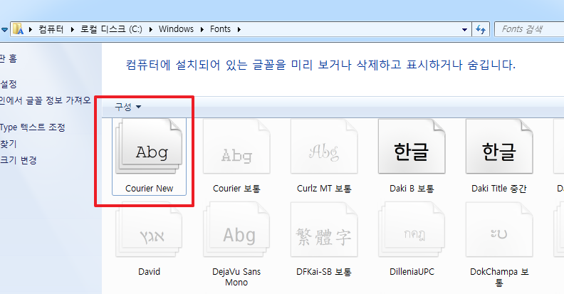위 화면처럼 Courier 보통 폰트도 활성화가 된 것을 확인할 수 있습니다.