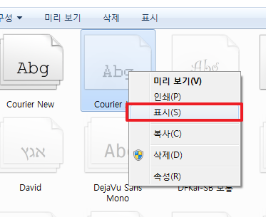 폰트 활성화는 비활성화 된 폰트에 마우스 우클릭을 하고 나온 메뉴에서 "표시" 버튼을 선택합니다. 저는 여기서 비활성화되어 있던 Courier 보통 폰트를 활성화 시켜보겠습니다.