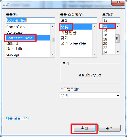 위와같이 Courier New, 보통, 12를 선택하고 확인을 클릭합니다.