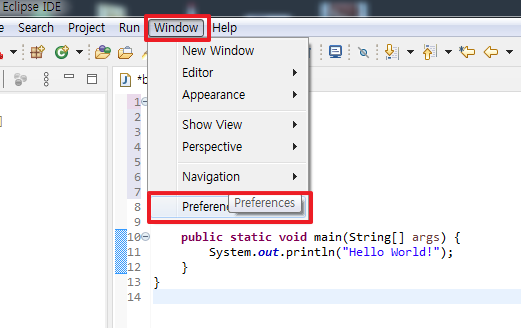 폰트를 변경하면 처음에 메뉴에서 Window -> Preference를 선택합니다.