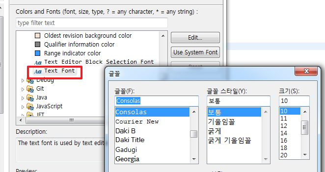Text Font -> Edit 항목을 클릭하면 글꼴이 나오는데 윈도우에서 기본 세팅인 상태라면 글꼴은 Consolas, 보통 크기는 10으로 되어 있을 것입니다. 이 폰트가 마음에 드신다면 크기만 변경하셔도 됩니다.