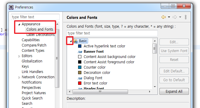 Appearance -> Colors and Fonts -> Basic 항목에서 내려 갑니다.