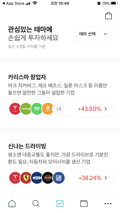 그리고 정말 마음에 드는 기능은 바로 테마추천입니다. 내가 원하는 종목이 어떤 테마인지 그리고 유사한 종목들은 현재 어느정도 올랐는지 쉽게 볼 수 있고 테마에 있는 종목을 한번에 투자할 수 있습니다.