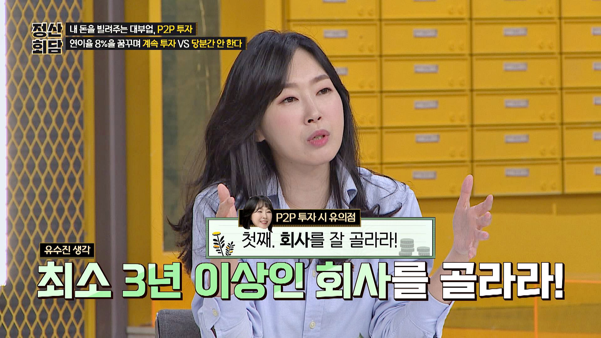 투자 종목은 "유수진"이라는 필명 "부자언니"가 운영하는 카페에서 알았는데 유수진 자산관리사가 이 문제 때문에 한동안 힘들어 했던것이 보일 정도였더군요. JTBC 정산회담에서 유수진은 이 문제 때문에 P2P 부동산 소액 투자를 부정적으로 보기 시작했었고 정 한다면 정말 여러가지 고민을 해가면서 투자를 하라 하더군요.