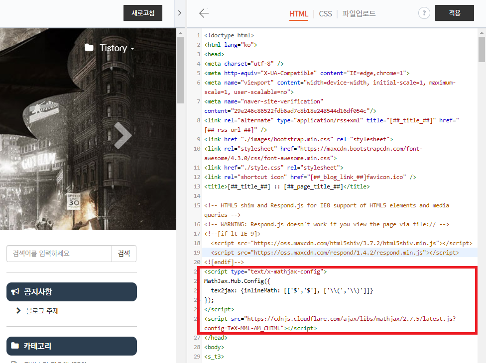 필자의 블로그는 티스토리이기 때문에 티스토리 기준으로 설명을 드리면, 티스토리에서 스킨 편집 -> HTML 편집으로 들어가셔서 적절한 위치에 아래 태그를 삽입합니다.