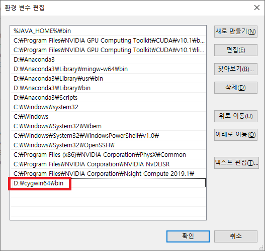 cygwin64를 설치한 위치가 D 드라이브이고, 설치한 폴더 + bin 위치를 환경 변수(Path)에 포함시킨다.