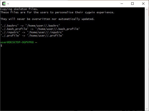 패키지를 모두 다 설치하면 다음과 같이 cygwin의 터미널(terminal)을 실행할 수 있는데 이건 필자가 원하는 모습이 아니다. 나는 그냥 윈도우 커맨드에서 가볍게 ls를 때리고 싶기 때문이다.
