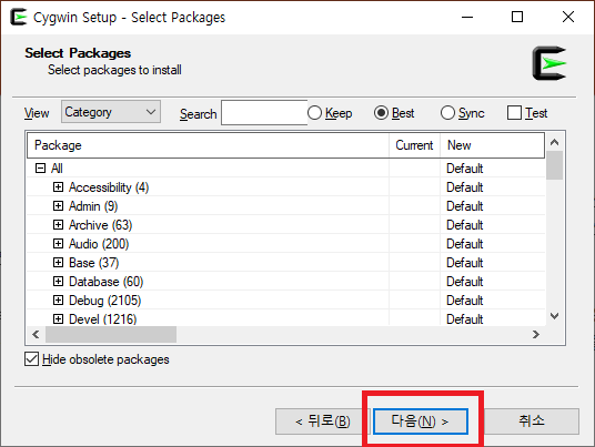 cygwin.com에 들어가면 위와 같은 화면이 나오는데 Intalling Cygwin쪽에 있는 setup-x86_64.exe를 클릭하여 설치(해당 포스팅은 64비트 기준으로 진행한다)한다.