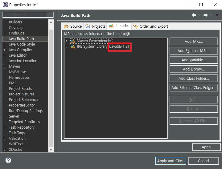 이와같이 build path의 자바 버전도 JavaSE-1.8로 변경된 것을 확인할 수 있다.