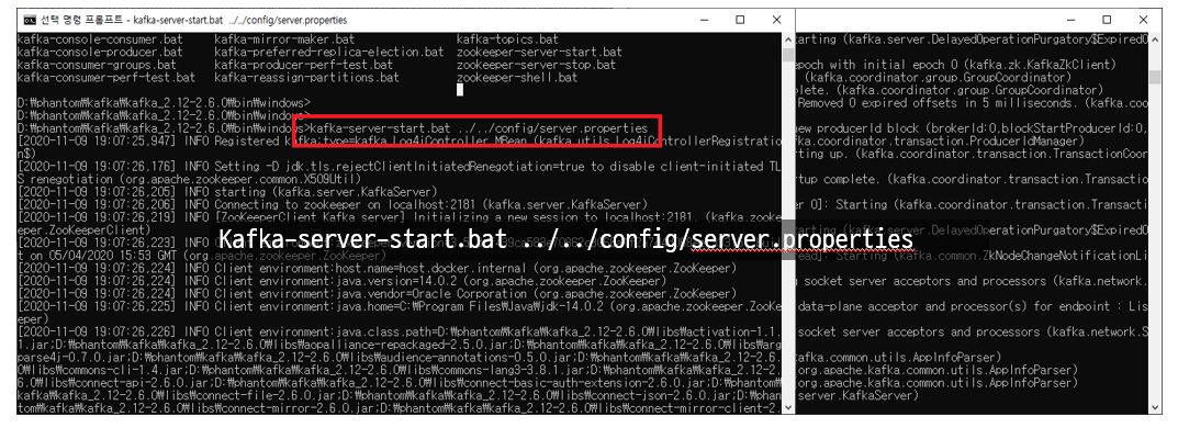 Command 창을 열 고, 카프카 설치폴더/bin/windows 폴더로 이동한 후 아래 실행문을 입력하여 카프카를 구동한다.