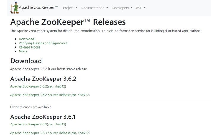 위 사이트에서 Apache ZooKeeper 3.6.2(asc, sha512)를 클릭하면 다운로드 사이트로 이동하게 되며 압축파일을 받고 아래와 같은 프로세스를 진행하도록 한다.