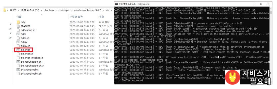 1. 주키퍼의 bin 폴더로 간 후, zkServer.cmd 파일을 실행한다.