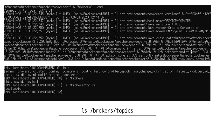 - zkCli.cmd 명령어를 실행한다 (주키퍼의 다양한 명령어를 실행할 수 있다)