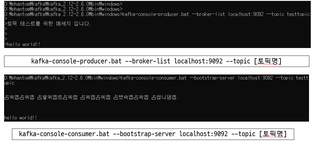 kafka-console-producer.bat --broker-list localhost:9092 --topic [토픽명]