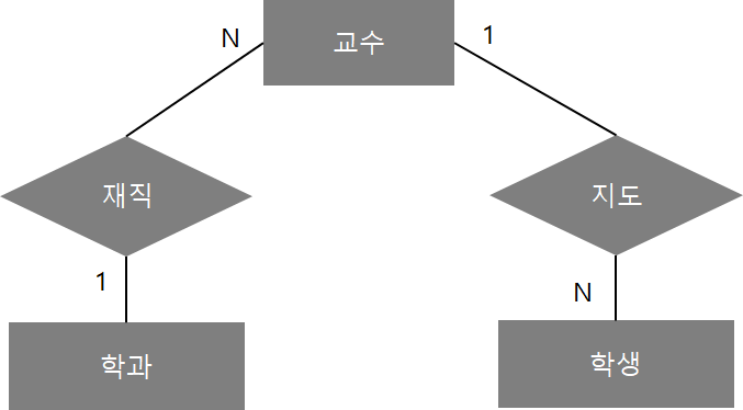 유재석이라는 교수 경우 상경대학인것을 알 수 있지만 경영과 경제 둘중에 어디에 소속되어 있는지를 알 수가 없다. 이처럼 관계가 존재하지만 어디에 속해 있는지 모호한 경우 부채꼴 함정이라 한다. ERD를 보면 1:N으로 속해 있어서 별 문제가 없어 보이지만, 실제 결과는 위 개념도같이 관계가 명확하지 않다.