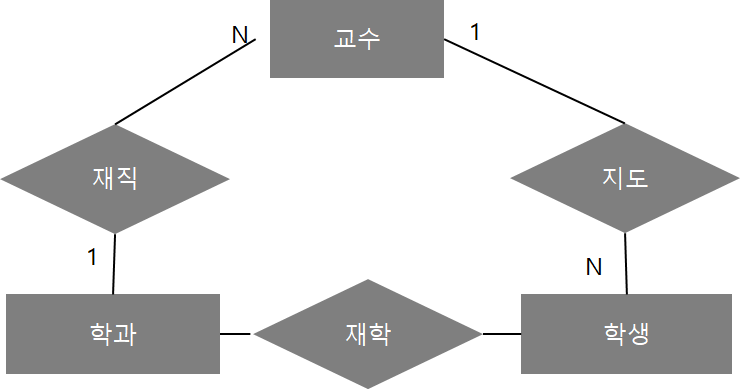 균열함정을 해결하기 위해서 위와 같이 재학이라는 관계를 신규 추가하였다. 즉 학생의 학과를 알기 위해서 지도교수를 걸쳐 아는 것이 아니라 학과와 직접적으로 관계를 맺어서 함정을 해결한다.