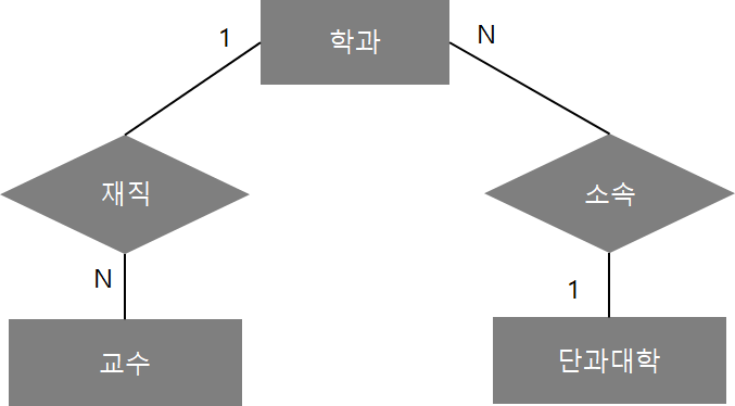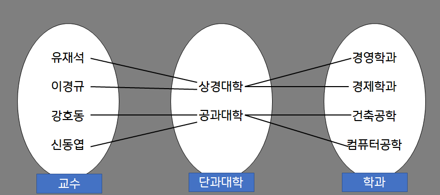부채꼴의 함정은 겉으로 보기에는 이상이 없는 1:N 구조로 보였지만 실상 펼쳐보면 N:M과 같은 구조였다. 이를 해결하기 위해서는 1:N의 구조를 명확하게 해야 된다. 위 개념도 같이 교수를 학과에 연결하고 학과는 단과대학에 연결하여 N:M 구조를 1:N으로 명확하게 하였다.
