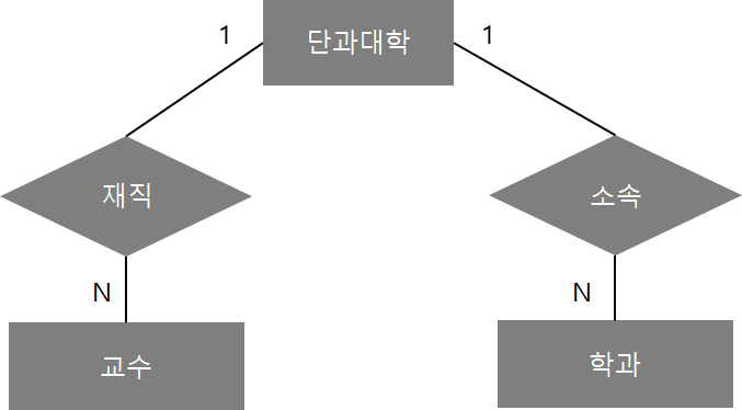 유재석이라는 교수 경우 상경대학인것을 알 수 있지만 경영과 경제 둘중에 어디에 소속되어 있는지를 알 수가 없다. 이처럼 관계가 존재하지만 어디에 속해 있는지 모호한 경우 부채꼴 함정이라 한다. ERD를 보면 1:N으로 속해 있어서 별 문제가 없어 보이지만, 실제 결과는 위 개념도같이 관계가 명확하지 않다.