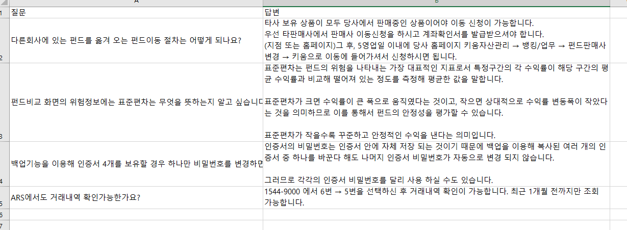 위 파일은 아래와 같이 2개의 시트(Sheet)로 구성되어 있고, 첫번째 시트는 4개의 키움증권 FAQ 데이터, 두번째 시트는 2개의 카카오뱅크 FAQ 데이터이다.