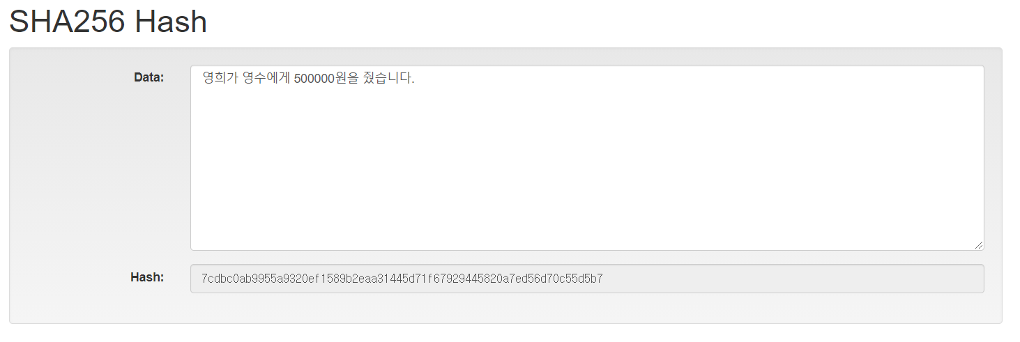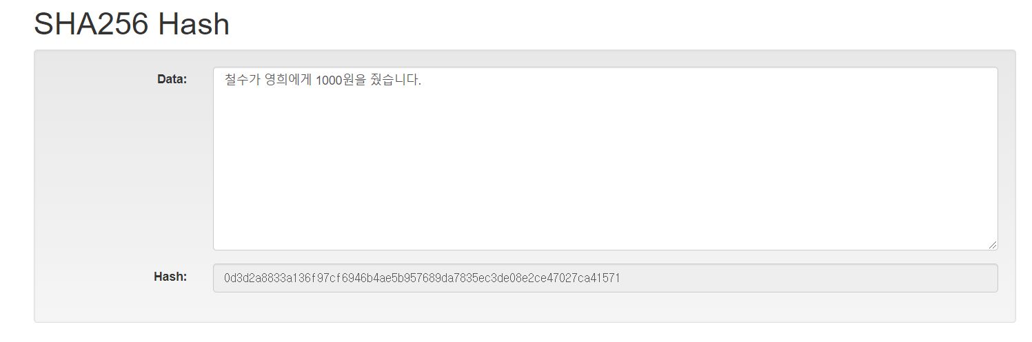 위 해쉬를 테스트해볼 수 있는 사이트에서 철수가 영희에게 1000원을 줬다는 내용을 "0d3d2a8833a136f97cf6946b4ae5b957689da7835ec3de08e2ce47027ca41571" 값으로 변환하였다. 우리는 좀 더 개념을 쉽게 파악하기 위해 앞글자 10자만 따오기로 한다. 즉 철수가 영희에게 1000원을 줬다라는 내용은 "0d3d2a8833"로 치환할 수 있다.