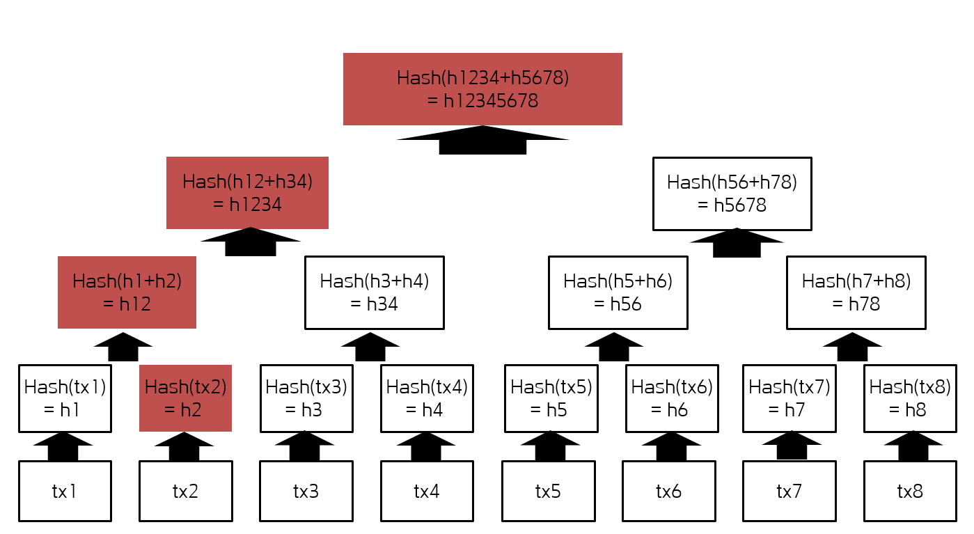 위 그림에서 붉은색 해쉬 값이 변형된 해쉬값들이며, 최종 머클루트도 완전히 바뀌게 된다는 것을 알 수 있다. 이를 통해 노드 검증자는 이상이 있는 해쉬값을 선별하여, 찾아내고 위변조가 될 경우 해당 노드에게 패널티 혹은 추방을 하여 악의적인 조작을 할 수 없게 만들 수 있을 것이다.