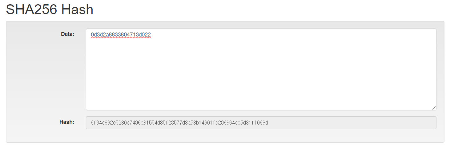 위 2개의 값을 합쳐서 8f84c682e5230e7496a31554d35f28577d3a53b14601fb296364dc5d31ff088d와 같은 해쉬가 나오게 되었고, 여기서 다시 앞글자 10개를 따오면 "8f84c682e5"값이 된다.