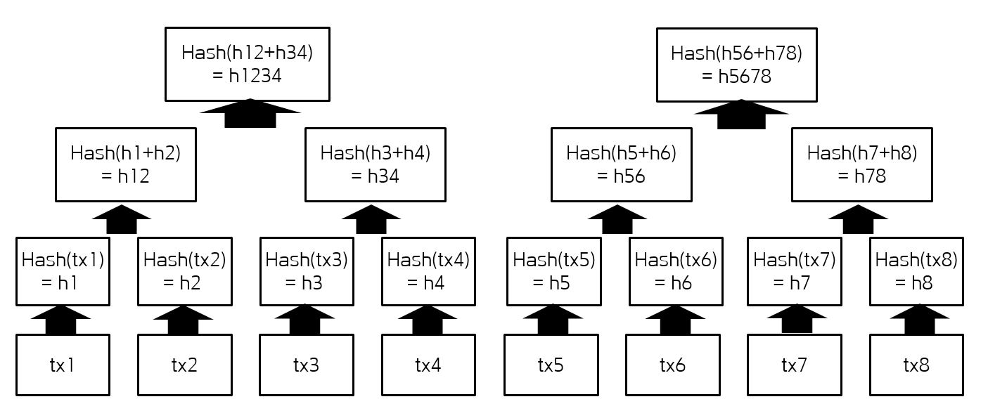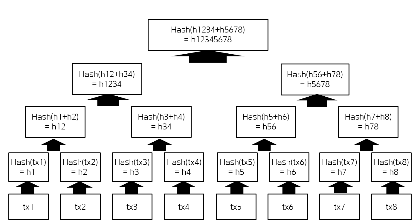 이렇게 계속 합치다보면 최종 1개가 나오게 되는데 이때 나오는 마지막 값이 머클루트(Merkle Root)가 되며 루트 해쉬(Root Hash)라고도 한다. 그리고 이 값은 블록의 헤더에 저장이 되어 블록을 매우 쉽고 빠르게 검증할 수 있게 만들어 준다.