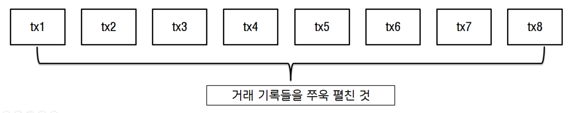 우선 "철수가 영희에게 1000원을 줬다"와 같은 거래 기록들을 쭈욱 나열을 한다. 이때 tx라고 적은 이유는 컴퓨터에서 어떤 작업을 처리하는 단위를 트랜잭션(transaction)이라고 하기 때문이다. 즉 tx1은 우리가 볼 땐 거래기록1이지만 컴퓨터 관점으로는 트랜잭션1이 되는 것이다.