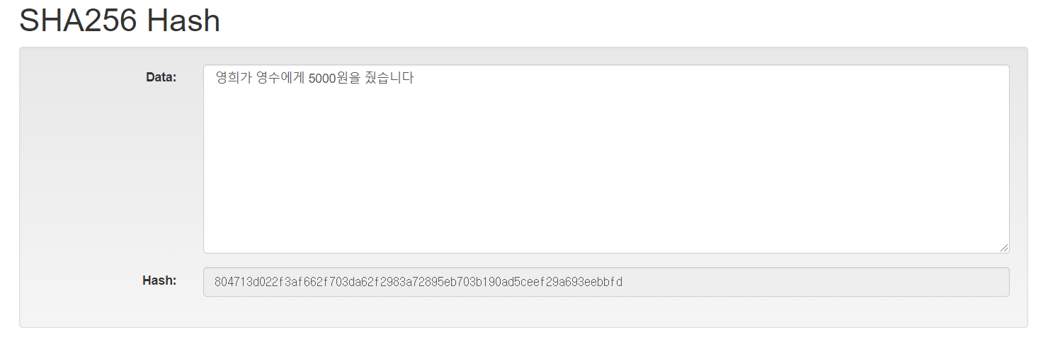 804713d022f3af662f703da62f2983a72895eb703b190ad5ceef29a693eebbfd 해쉬값이 생성되고 앞글자 10개만 가지고 오면, "804713d022"값이 된다. 즉 영희가 영수에게 5000원을 줬습니다란 804713d022가 되는 것이다. 그럼 이 2번째 해쉬값과 첫번째 해쉬값을 합쳐보도록 한다.