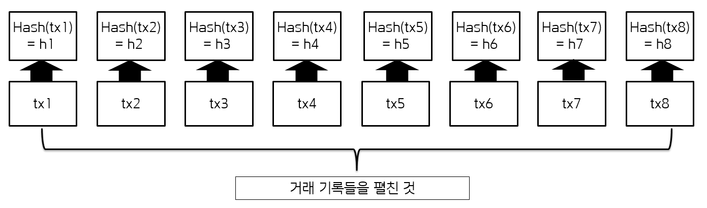 우선 "철수가 영희에게 1000원을 줬다"와 같은 거래 기록들을 쭈욱 나열을 한다. 이때 tx라고 적은 이유는 컴퓨터에서 어떤 작업을 처리하는 단위를 트랜잭션(transaction)이라고 하기 때문이다. 즉 tx1은 우리가 볼 땐 거래기록1이지만 컴퓨터 관점으로는 트랜잭션1이 되는 것이다.