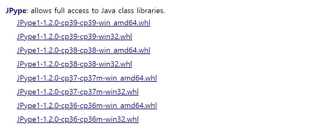 필자의 가상환경은 현재 파이썬 3.8을 설치하였기 때문에 JPype1-1.2.0-cp38-cp38-win_amd64.whl을 다운로드 하였고,
