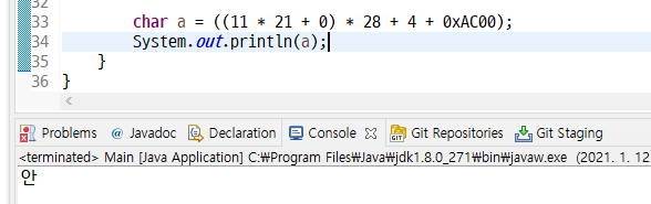 위의 배열값을 기반으로 "안"이라는 말을 뽑자면, 초성의 "ㅇ"는 11번째, "ㅏ"는 0번째, "ㄴ"는 4번째위치에 존재한다. 이 값을 그대로 자바에서 코딩을 하면