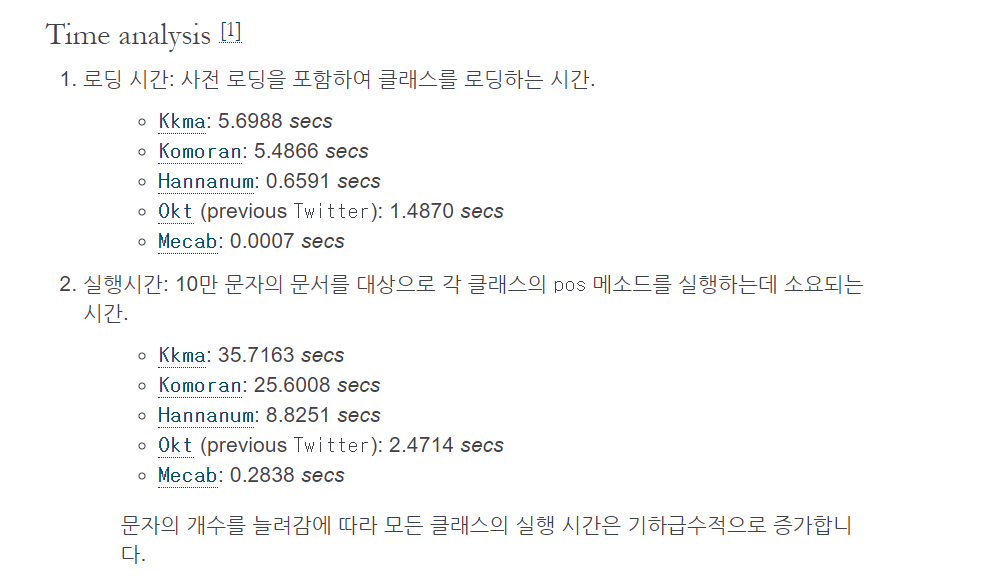 kolnpy 사이트에 있는 속도 비교 항목을 보면, 비록 Okt가 제일 빠르지는 않지만 꼬꼬마, 코모란이 로딩에 5초 정도 걸리는 것에 비해 1.48초라는 합리적인 속도가 소비되며, 가장 중요한 10만 문자의 분석 시간에 Mecab(은전한닢)보다는 느리지만, 2.47초로 코모란보다 10배, 꼬꼬마보다는 17배 정도 빠른 속도를 보여주고 있다.