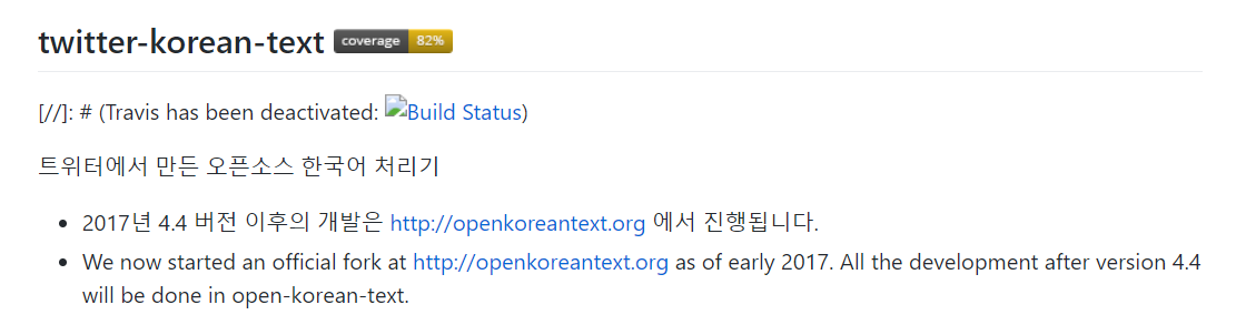Okt(Open Korean Text)는 트위터에서 만든 오픈소스 한국어 처리기인 twitter-korean-text를 이어받아 만들고 있는 프로젝트이다.