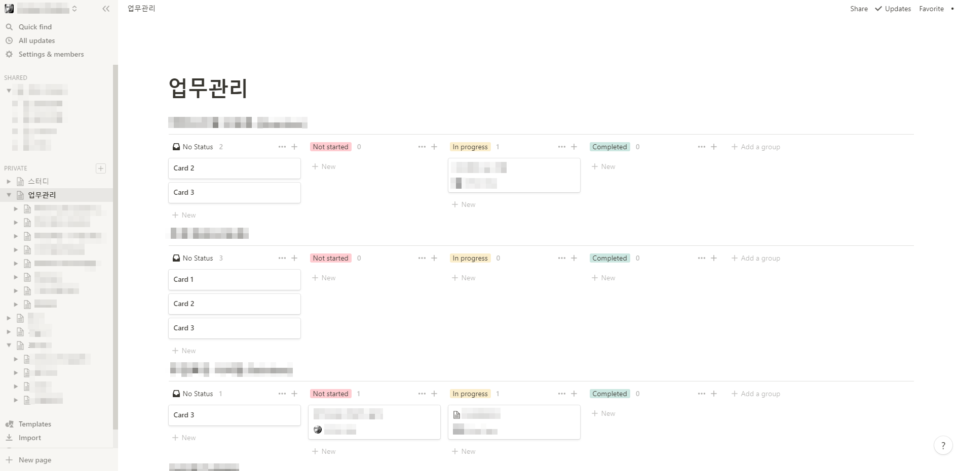 그러나 노션의 강력한 점은 커스터마이징(Custormizing)이라는 것이다. 메뉴를 서브로 만들 수 있기 때문에 이와같이 관리도 업무관리라는 대 카테고리에 중 카테고리로 프로젝트들을 페이지로 만들어서 한 눈에 볼 수 있게 된다. 즉, 내가 원하는 형태의 칸반을 만들 수 있는 것이다.