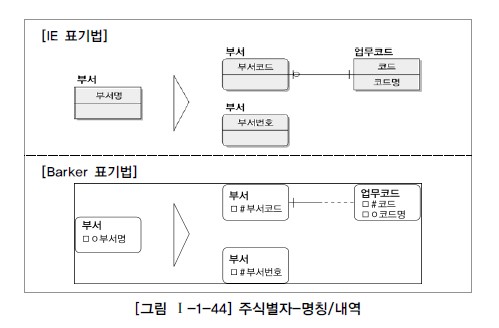 | 대표성 여부 | 주식별자 | 엔터티를 구분할 수 있으며, 타 엔터티와 참조관계를 연결할 수 있음 |