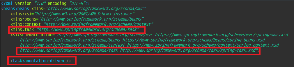 xmlns:task라는 스키마를 등록하는 것과 스키마경로를 지정 한후, 하단에 task:annotation-drive 태그를 입력한다.