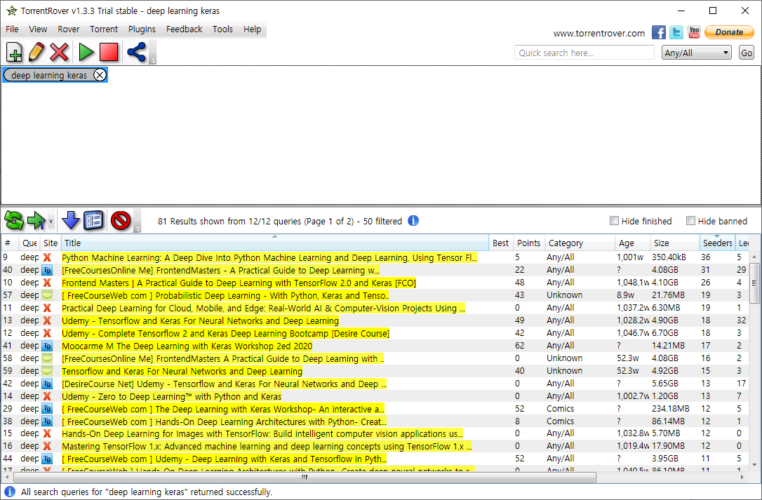 물론 토렌트에서 이런 자료를 찾지는 않겠지만 "deep learning keras"를 입력하였고 수많은 시드들이 나온 것을 확인할 수 있다. 아래의 설명에서 대충 보면 Age는 시드가 유지가 된 시간으로 보이고 Size는 파일 사이즈, Seeders는 현재 토렌트를 유지하는 사람들의 수가 표시된 것으로 예상된다.