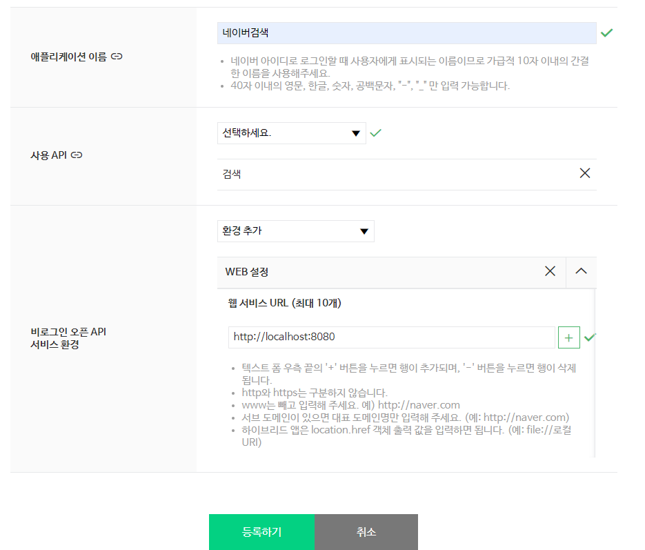 사용 API는 검색을 선택하고 환경을 추가로 설정하는데 웹 형태로 만들고 싶고 내 로컬에서 작업을 하고 싶다면, 위와 같이 로컬호스트 주소를 입력하고 등록하기를 선택한다.