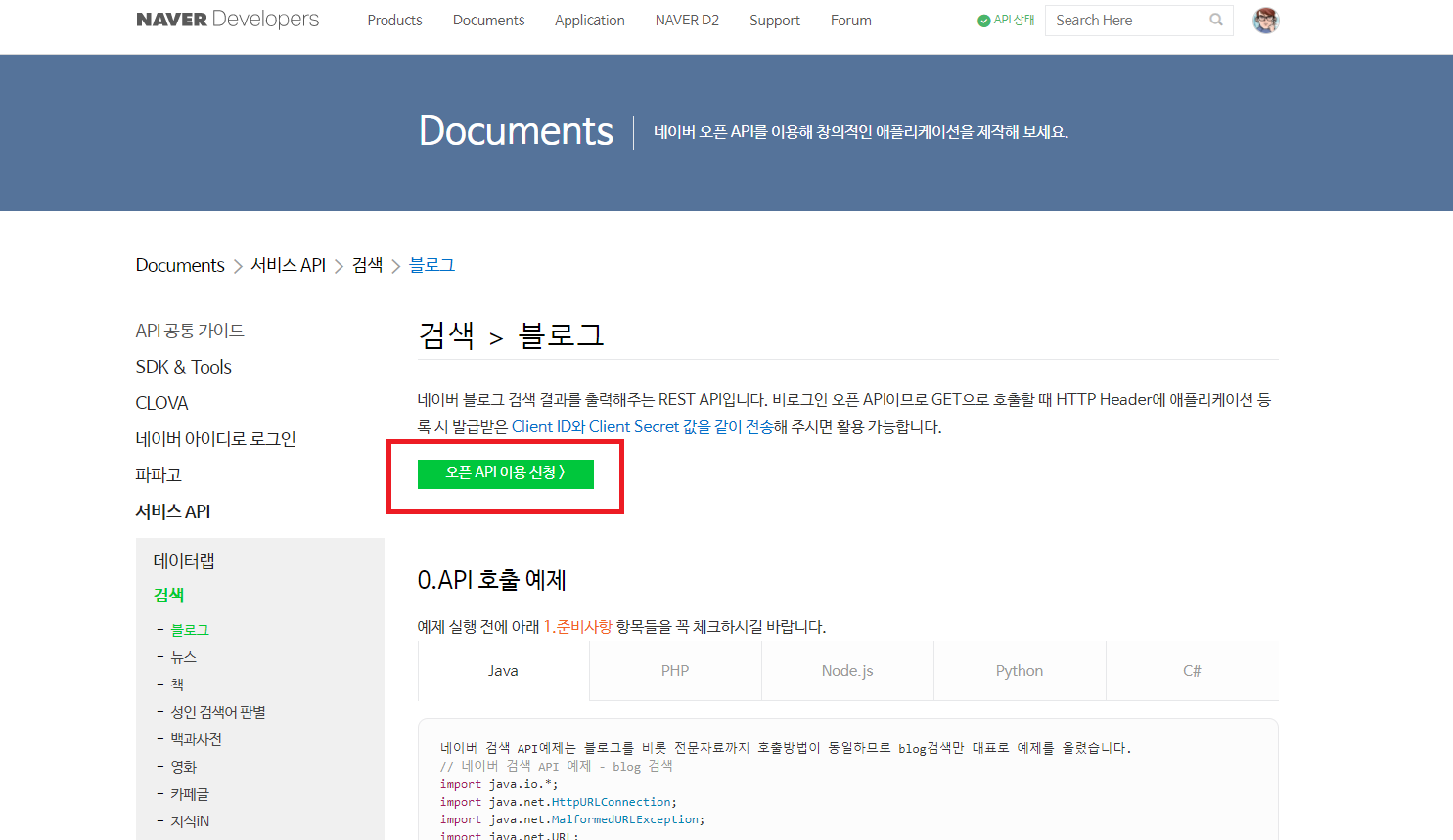 위 링크로 들어가면 위와 같이 녹색으로 되어 있는 오픈 API 이용 신청 버튼이 존재한다. 이 녀석을 클릭하고