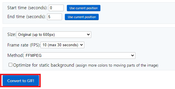 비디오를 업로드하면 화면이 전환되면서, GIF를 설정하는 페이지가 뜨는데 Start Time과 End time은 동영상의 시작과 종료 타임을 지정하는 것이고, Size는 이미지의 픽셀 크기를 지정하며, Frame은 움짤의 프레임(초당 보여주는 화면, 얼마나 자연스러운지 높을수록 자연스럽지만 용량이 많아집니다) 변환하는 메소드 등등을 선택할 수 있습니다.