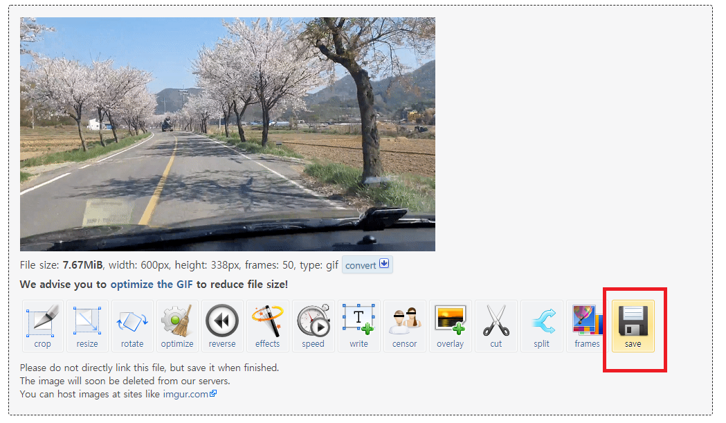 Save를 선택하면 현재의 설정으로 GIF가 만들어지게 됩니다. (뭐 건드린거 없이 위에서는 Next Next 한 것 뿐)