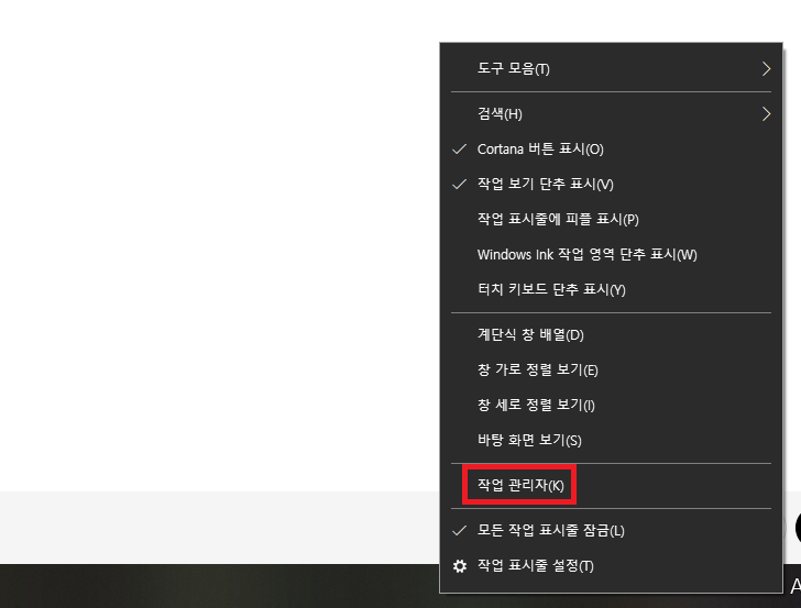 우선 윈도우 하단의 작업 영역에서 마우스 우클릭(혹은 윈도우키 + X)을 한 후, 작업 관리자를 띄운다.