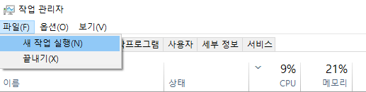 작업 관리자를 띄웠다면 여기서 파일을 선택 후, 새 작업 실행을 선택한다.