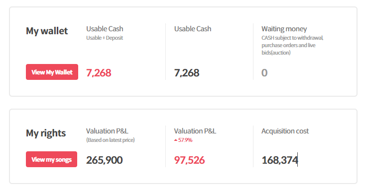 실험삼아 매수했기 때문에 매우 소액이지만 벌었다는 것이 어디인가.... 저 돈이면 왠만한 적금 이자보다 높고 내 귀가 한 몫했다라는 사실에 만족하기만 하다. 매일 주식과 암호화폐로 몇십만원의 수익을 내고 있지만, 뮤직카우의 97000원이란 돈은 참 다르게 다가오는 것 같다.