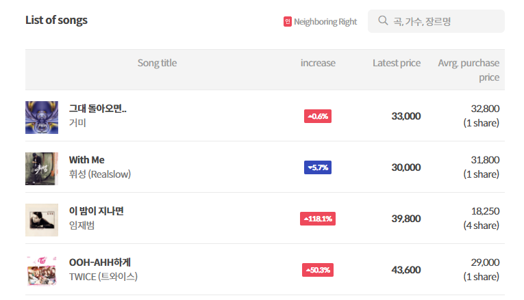 물론 마음에 든 노래를 매수하면서, 나도 음악 저작권을 가진 사람인가? 나름 뿌듯해하며 좋아하면서 당시 실험삼아 산 몇개의 곡 이후로 뮤직카우는 한계점을 느끼게 잊고 있었다. 당시에 내가 느낀 후기는 아래 작성한 포스팅을 보면 될 것 같다.